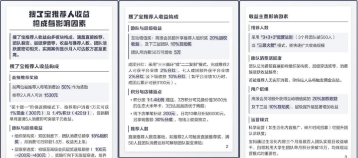 另一方面,参与者家属的质疑声和公安机关的调查结论,共同勾勒出项目的真实面貌。我们从一个“搜了宝”参与者家属的手中获得了一份“搜了宝”详细的运作模式,从获得的内部运作模式可以看出,平台设置的“邀请好友领惊喜好礼”机制,以及根据推广情况发放“分成分润奖励”的规则,完全符合传销通过发展下线获取收益的基本特征。