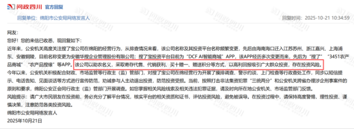 2025年10月21日,四川省绵阳市公安局网络发言人在回复网友提问时指出,“搜了宝”投资平台及其公司频繁更名,以助农名义,采取寄存代收、代销获利、买一赠十、赠送积分等方式,以高利回报吸引广大群众投资,存在重大投资风险。